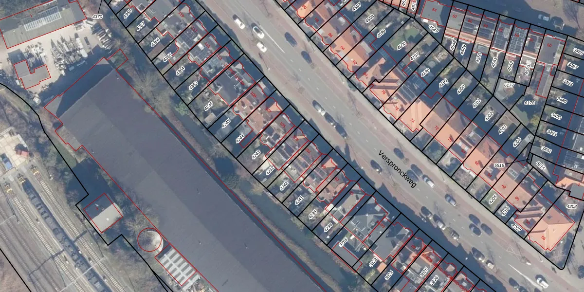 Het perceel waarop Verspronckweg 103 staat heeft een oppervlakte van 176 m². Dit is een middelgroot perceel. De perceeloppervlakte wordt geregistreerd door het Kadaster. Gedetailleerde informatie over de maten van dit perceel kunt u vinden in het rapport Kadastrale kaart met maatvoering van Verspronckweg 103.