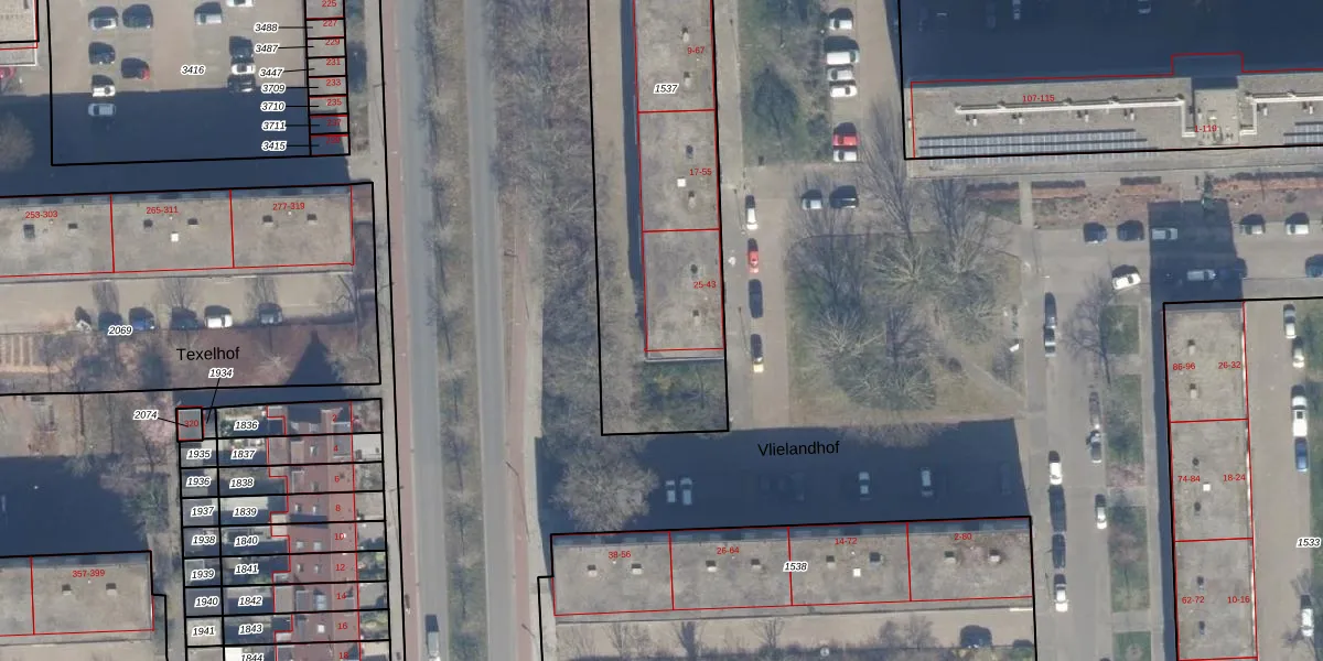 Het perceel waarop Vlielandhof 31 staat heeft een oppervlakte van 1636 m². Dit is een zeer groot perceel. De perceeloppervlakte wordt geregistreerd door het Kadaster. Gedetailleerde informatie over de maten van dit perceel kunt u vinden in het rapport Kadastrale kaart met maatvoering van Vlielandhof 31.