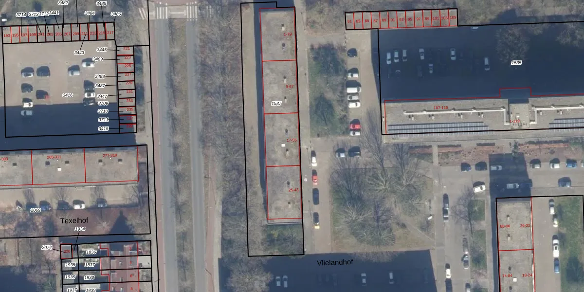 Vlielandhof 45 is gelegen op kadastraal perceel HLM02Y1537. Deze kadastrale aanduiding is uniek en wordt gebruikt door het Kadaster om eigendomsrechten en andere zakelijke rechten vast te leggen. Het perceel maakt onderdeel uit van de kadastrale gemeente Haarlem.