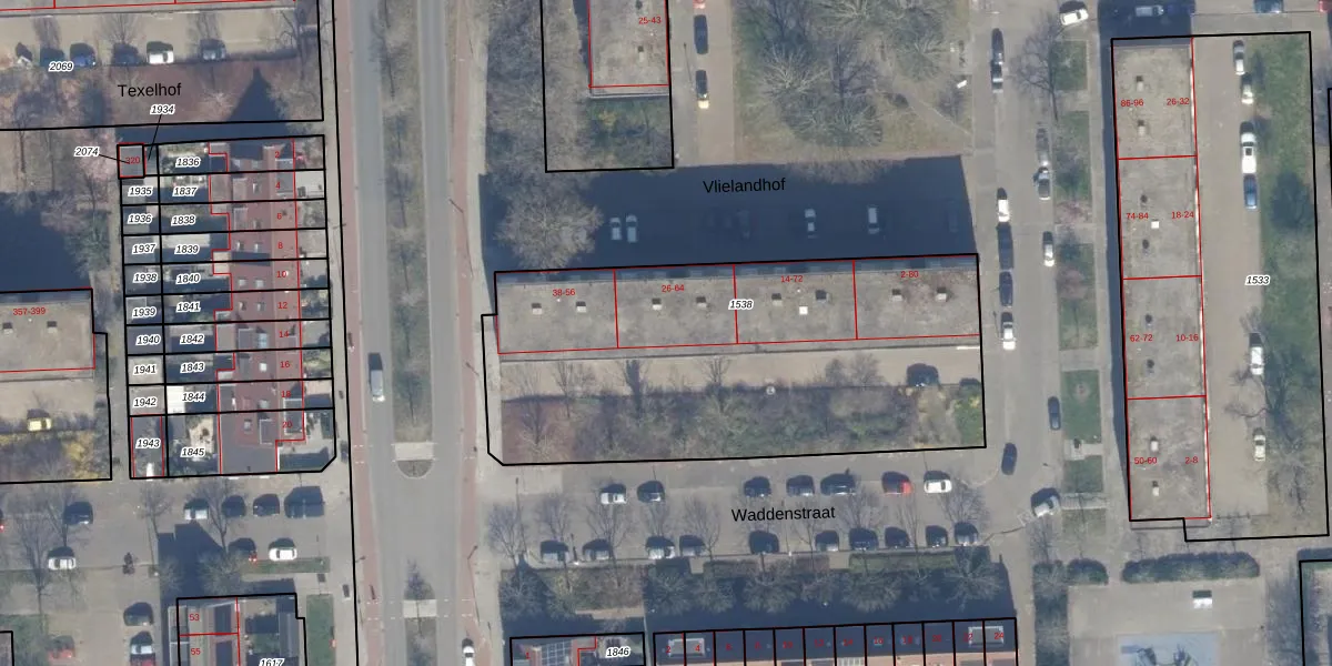 Het perceel waarop Vlielandhof 60 staat heeft een oppervlakte van 2117 m². Dit is een zeer groot perceel. De perceeloppervlakte wordt geregistreerd door het Kadaster. Gedetailleerde informatie over de maten van dit perceel kunt u vinden in het rapport Kadastrale kaart met maatvoering van Vlielandhof 60.