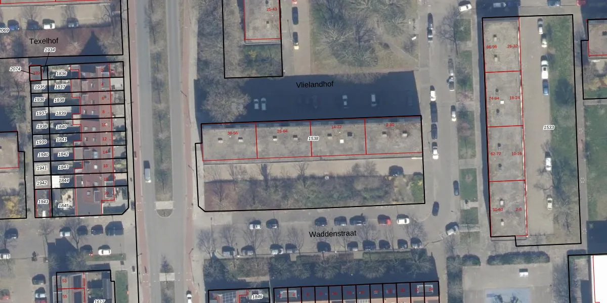 Het perceel waarop Vlielandhof 64 staat heeft een oppervlakte van 2117 m². Dit is een zeer groot perceel. De perceeloppervlakte wordt geregistreerd door het Kadaster. Gedetailleerde informatie over de maten van dit perceel kunt u vinden in het rapport Kadastrale kaart met maatvoering van Vlielandhof 64.
