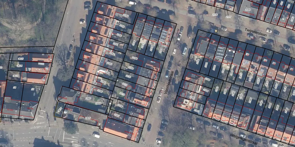 Gebruik de zoekbalk of klik op een perceel voor informatie over de adressen binnen dit perceel.