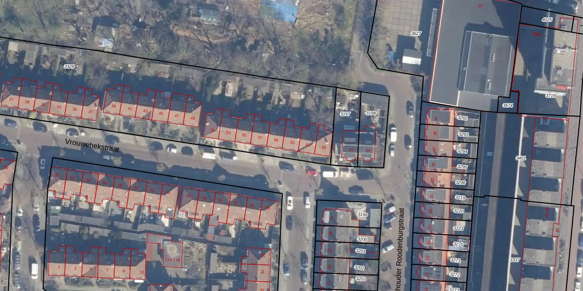Vrouwehekstraat 61 is gelegen op kadastraal perceel HLM01G3324. Deze kadastrale aanduiding is uniek en wordt gebruikt door het Kadaster om eigendomsrechten en andere zakelijke rechten vast te leggen. Het perceel maakt onderdeel uit van de kadastrale gemeente Haarlem.