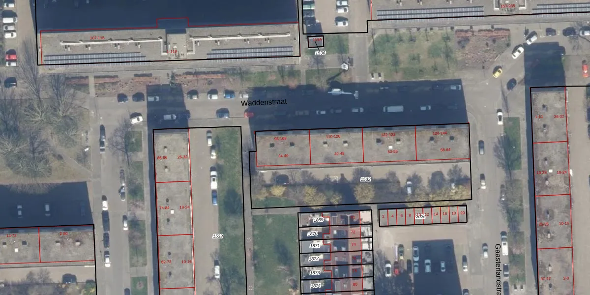 Het perceel waarop Waddenstraat 108 staat heeft een oppervlakte van 1941 m². Dit is een zeer groot perceel. De perceeloppervlakte wordt geregistreerd door het Kadaster. Gedetailleerde informatie over de maten van dit perceel kunt u vinden in het rapport Kadastrale kaart met maatvoering van Waddenstraat 108.
