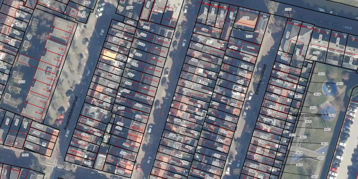 Gebruik de zoekbalk of klik op een perceel voor informatie over de adressen binnen dit perceel.