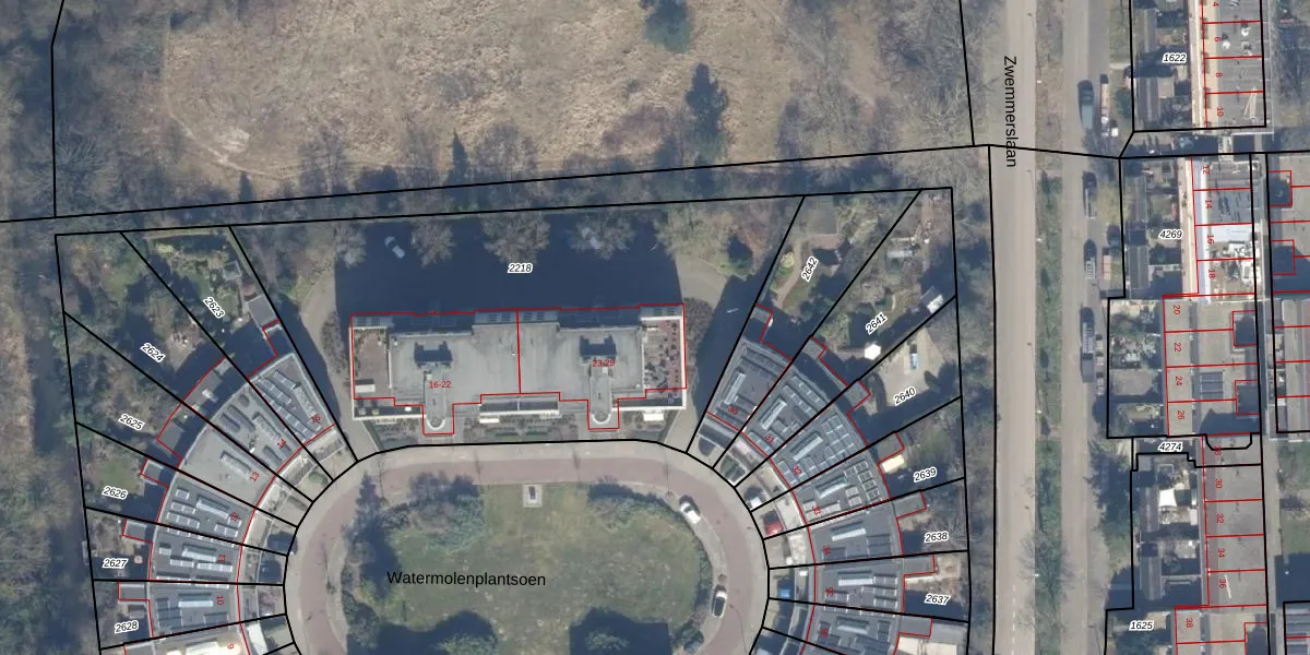 Het perceel waarop Watermolenplantsoen 29 staat heeft een oppervlakte van 2481 m². Dit is een zeer groot perceel. De perceeloppervlakte wordt geregistreerd door het Kadaster. Gedetailleerde informatie over de maten van dit perceel kunt u vinden in het rapport Kadastrale kaart met maatvoering van Watermolenplantsoen 29.