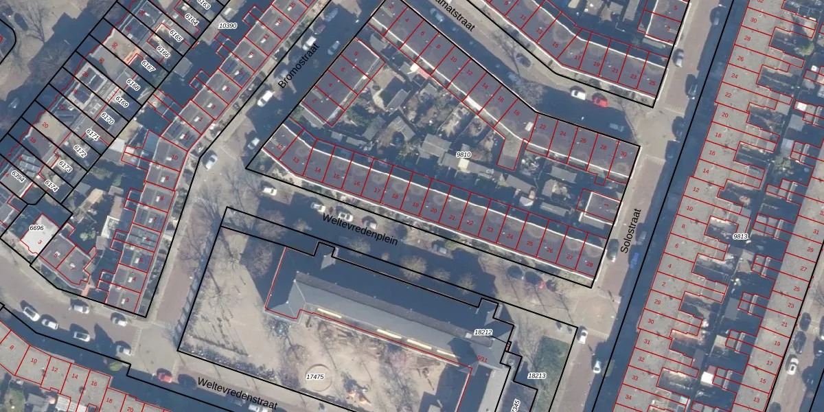 Het perceel waarop Weltevredenplein 19 staat heeft een oppervlakte van 3390 m². Dit is een zeer groot perceel. De perceeloppervlakte wordt geregistreerd door het Kadaster. Gedetailleerde informatie over de maten van dit perceel kunt u vinden in het rapport Kadastrale kaart met maatvoering van Weltevredenplein 19.