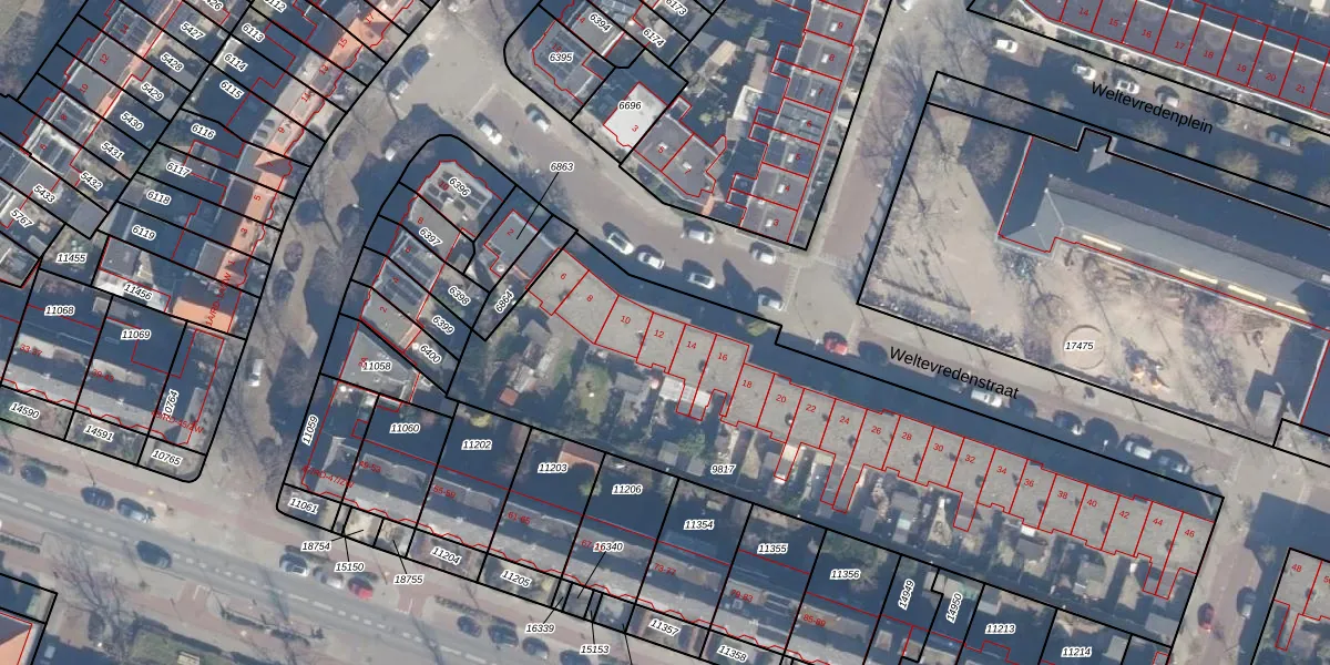 Het perceel waarop Weltevredenstraat 12 staat heeft een oppervlakte van 2750 m². Dit is een zeer groot perceel. De perceeloppervlakte wordt geregistreerd door het Kadaster. Gedetailleerde informatie over de maten van dit perceel kunt u vinden in het rapport Kadastrale kaart met maatvoering van Weltevredenstraat 12.