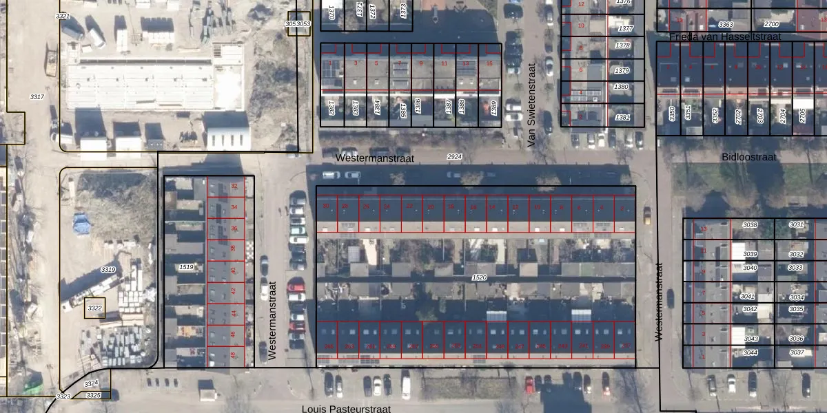 Het perceel waarop Westermanstraat 22 staat heeft een oppervlakte van 3405 m². Dit is een zeer groot perceel. De perceeloppervlakte wordt geregistreerd door het Kadaster. Gedetailleerde informatie over de maten van dit perceel kunt u vinden in het rapport Kadastrale kaart met maatvoering van Westermanstraat 22.