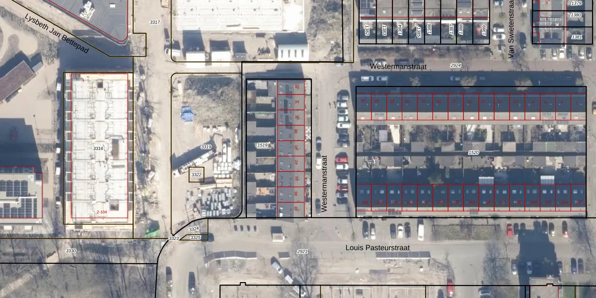 Het perceel waarop Westermanstraat 40 staat heeft een oppervlakte van 1008 m². Dit is een zeer groot perceel. De perceeloppervlakte wordt geregistreerd door het Kadaster. Gedetailleerde informatie over de maten van dit perceel kunt u vinden in het rapport Kadastrale kaart met maatvoering van Westermanstraat 40.