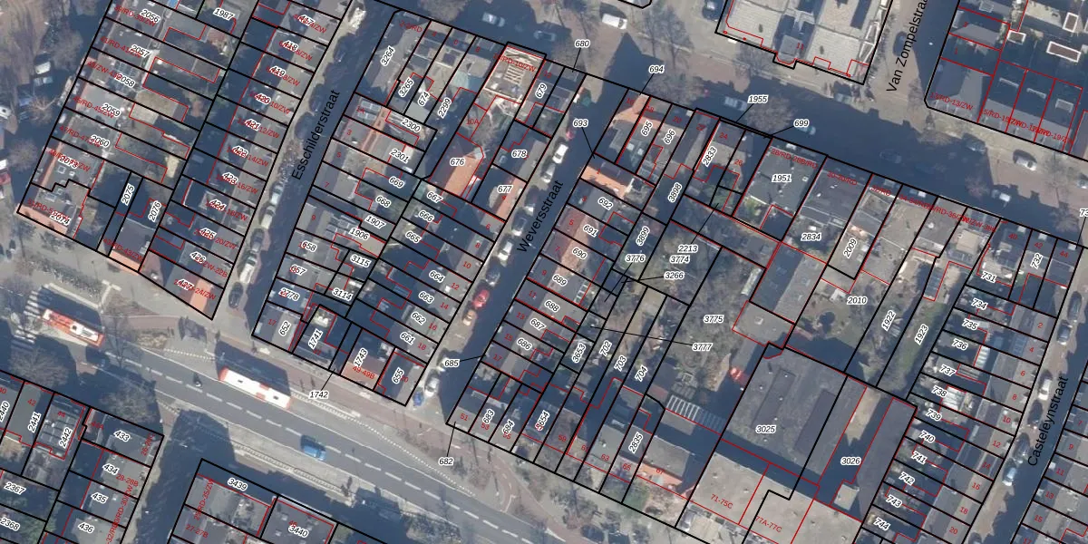 Het perceel waarop Weversstraat 9 staat heeft een oppervlakte van 68 m². Dit is een klein perceel. De perceeloppervlakte wordt geregistreerd door het Kadaster. Gedetailleerde informatie over de maten van dit perceel kunt u vinden in het rapport Kadastrale kaart met maatvoering van Weversstraat 9.