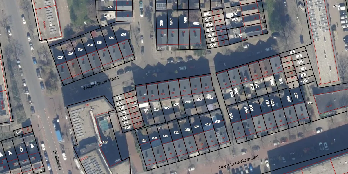 William Boothstraat 223 is gelegen op kadastraal perceel HLM02X973. Deze kadastrale aanduiding is uniek en wordt gebruikt door het Kadaster om eigendomsrechten en andere zakelijke rechten vast te leggen. Het perceel maakt onderdeel uit van de kadastrale gemeente Haarlem.