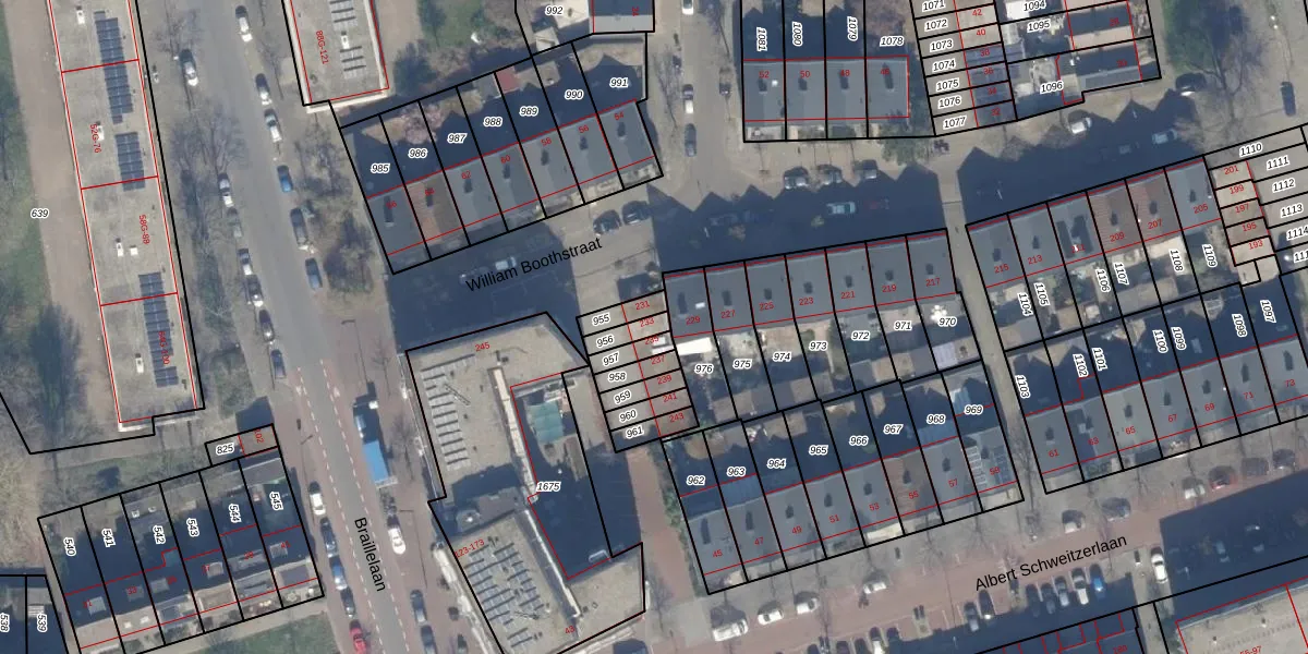 William Boothstraat 233 is gelegen op kadastraal perceel HLM02X956. Deze kadastrale aanduiding is uniek en wordt gebruikt door het Kadaster om eigendomsrechten en andere zakelijke rechten vast te leggen. Het perceel maakt onderdeel uit van de kadastrale gemeente Haarlem.