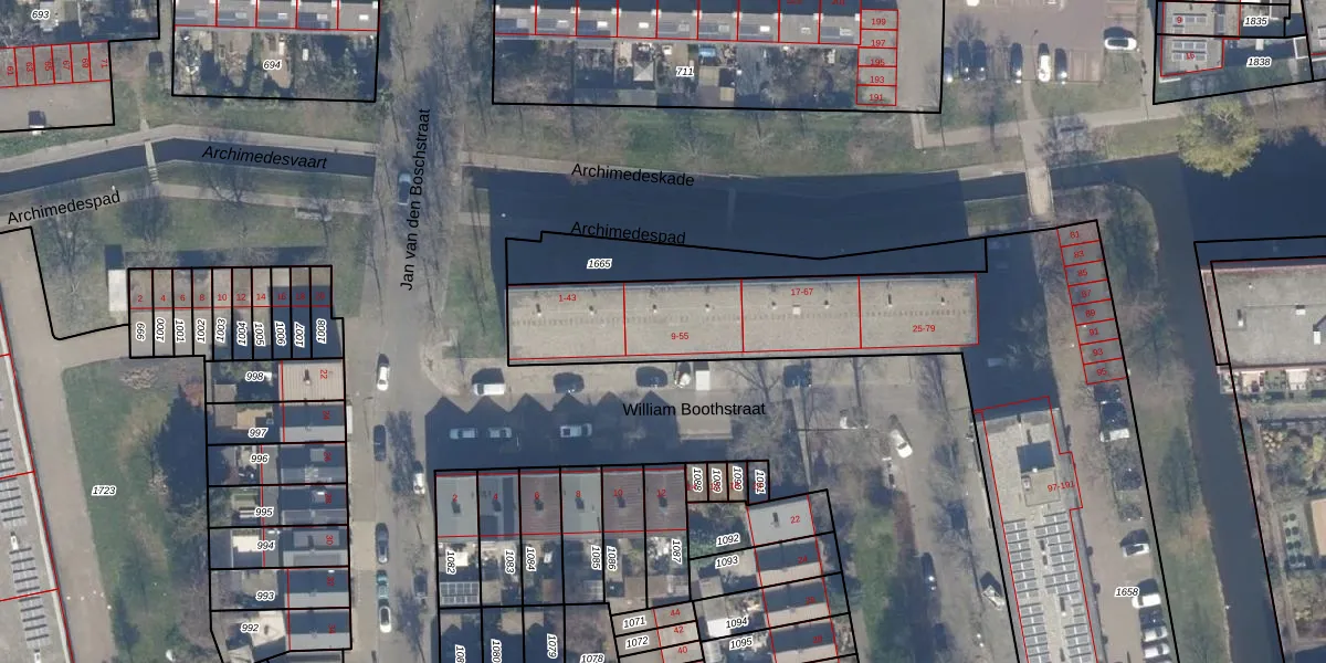 Het perceel waarop William Boothstraat 45 staat heeft een oppervlakte van 3230 m². Dit is een zeer groot perceel. De perceeloppervlakte wordt geregistreerd door het Kadaster. Gedetailleerde informatie over de maten van dit perceel kunt u vinden in het rapport Kadastrale kaart met maatvoering van William Boothstraat 45.