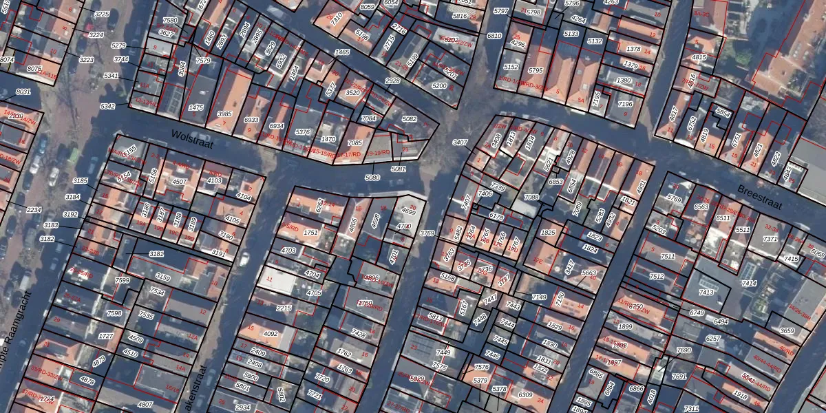 Het perceel waarop Wolstraat 20 staat heeft een oppervlakte van 63 m². Dit is een klein perceel. De perceeloppervlakte wordt geregistreerd door het Kadaster. Gedetailleerde informatie over de maten van dit perceel kunt u vinden in het rapport Kadastrale kaart met maatvoering van Wolstraat 20.