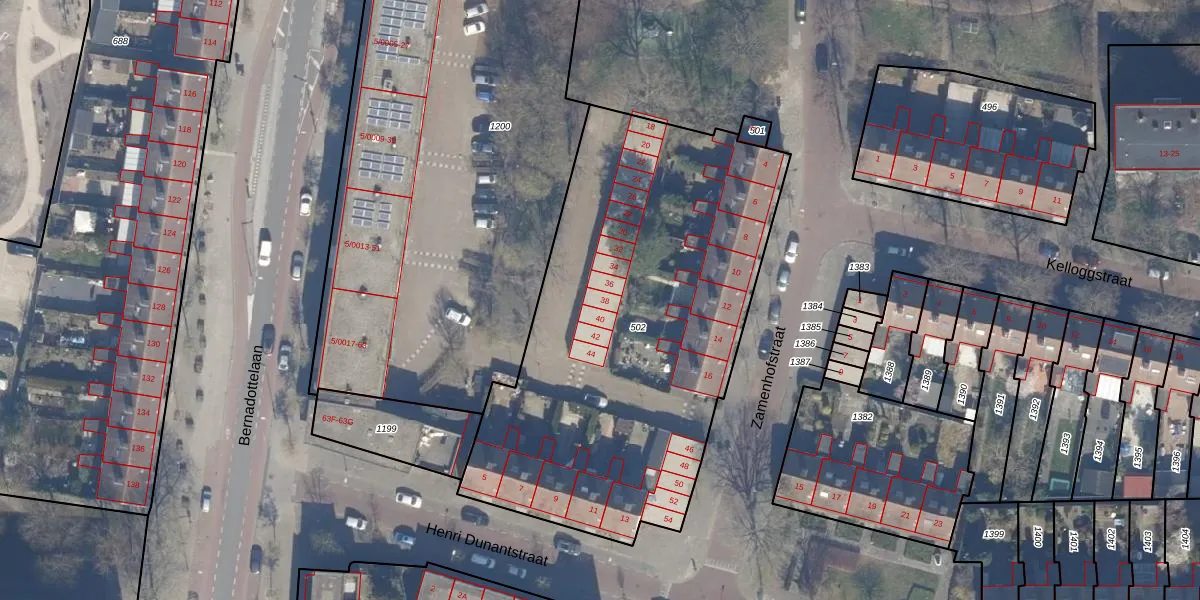 Het perceel waarop Zamenhofstraat 38 staat heeft een oppervlakte van 2376 m². Dit is een zeer groot perceel. De perceeloppervlakte wordt geregistreerd door het Kadaster. Gedetailleerde informatie over de maten van dit perceel kunt u vinden in het rapport Kadastrale kaart met maatvoering van Zamenhofstraat 38.