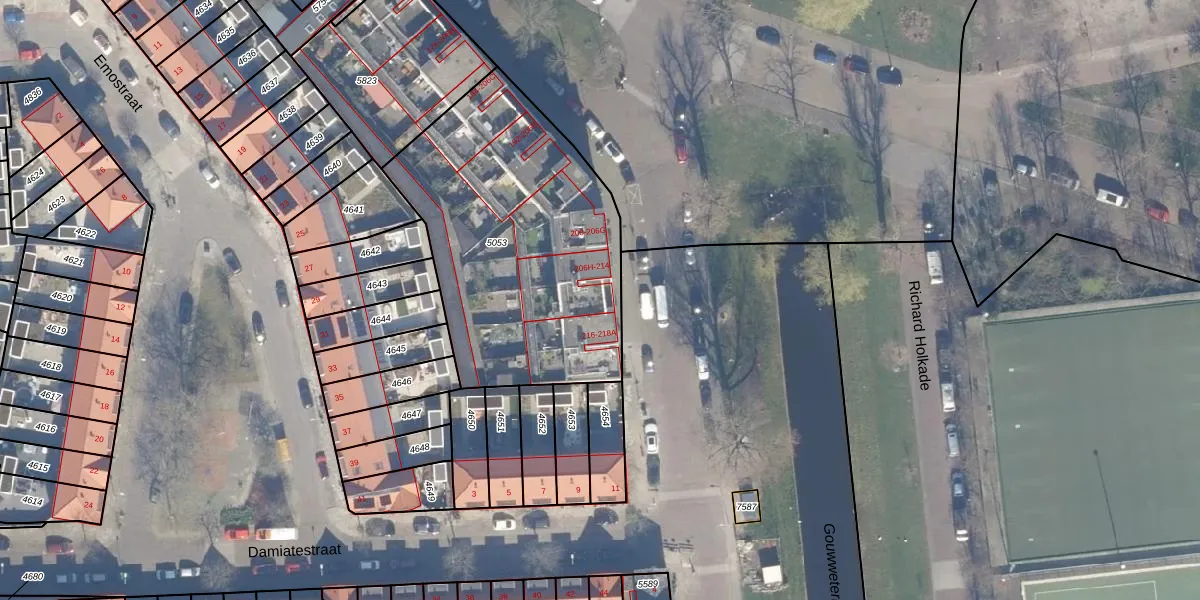 Het perceel waarop het adres ligt is HLM01-E-5053. De afkorting 'HLM01' staat voor kadastrale gemeente Haarlem. De oppervlakte van het perceel is 1413 m². Dat is groter dan gemiddeld in Haarlem, waar de gemiddelde perceeloppervlakte op 328,33 m² ligt. Het kleinste perceel in de kadastrale gemeente is 0 m² groot. De grootste perceeloppervlakte is 13,9 ha. Op het perceel zijn 26 adressen aanwezig. De huidige grenzen van het perceel zijn digitaal in de Basisregistratie Kadaster (BRK) geregistreerd op 28-11-1997.