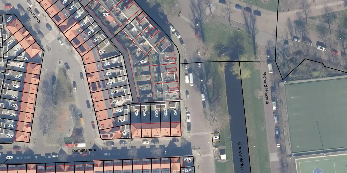 Het perceel waarop het adres ligt is HLM01-E-5053. De afkorting 'HLM01' staat voor kadastrale gemeente Haarlem. De oppervlakte van het perceel is 1413 m². Dat is groter dan gemiddeld in Haarlem, waar de gemiddelde perceeloppervlakte op 328,33 m² ligt. Het kleinste perceel in de kadastrale gemeente is 0 m² groot. De grootste perceeloppervlakte is 13,9 ha. Op het perceel zijn 26 adressen aanwezig. De huidige grenzen van het perceel zijn digitaal in de Basisregistratie Kadaster (BRK) geregistreerd op 28-11-1997.