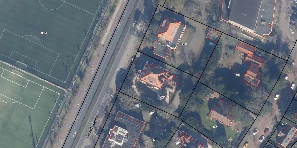Het perceel waarop Zuiderhoutlaan 10 staat heeft een oppervlakte van 1353 m². Dit is een zeer groot perceel. De perceeloppervlakte wordt geregistreerd door het Kadaster. Gedetailleerde informatie over de maten van dit perceel kunt u vinden in het rapport Kadastrale kaart met maatvoering van Zuiderhoutlaan 10.