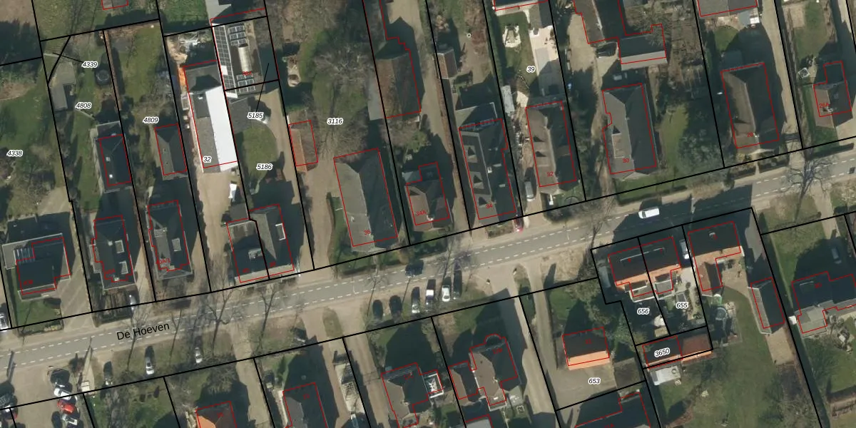 Het perceel waarop De Hoeven 34-A staat heeft een oppervlakte van 3967 m². Dit is een zeer groot perceel. De perceeloppervlakte wordt geregistreerd door het Kadaster. Gedetailleerde informatie over de maten van dit perceel kunt u vinden in het rapport Kadastrale kaart met maatvoering van De Hoeven 34-A.