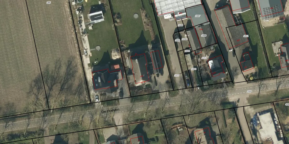 Het perceel waarop De Hoeven 60-E staat heeft een oppervlakte van 6835 m². Dit is een zeer groot perceel. De perceeloppervlakte wordt geregistreerd door het Kadaster. Gedetailleerde informatie over de maten van dit perceel kunt u vinden in het rapport Kadastrale kaart met maatvoering van De Hoeven 60-E.