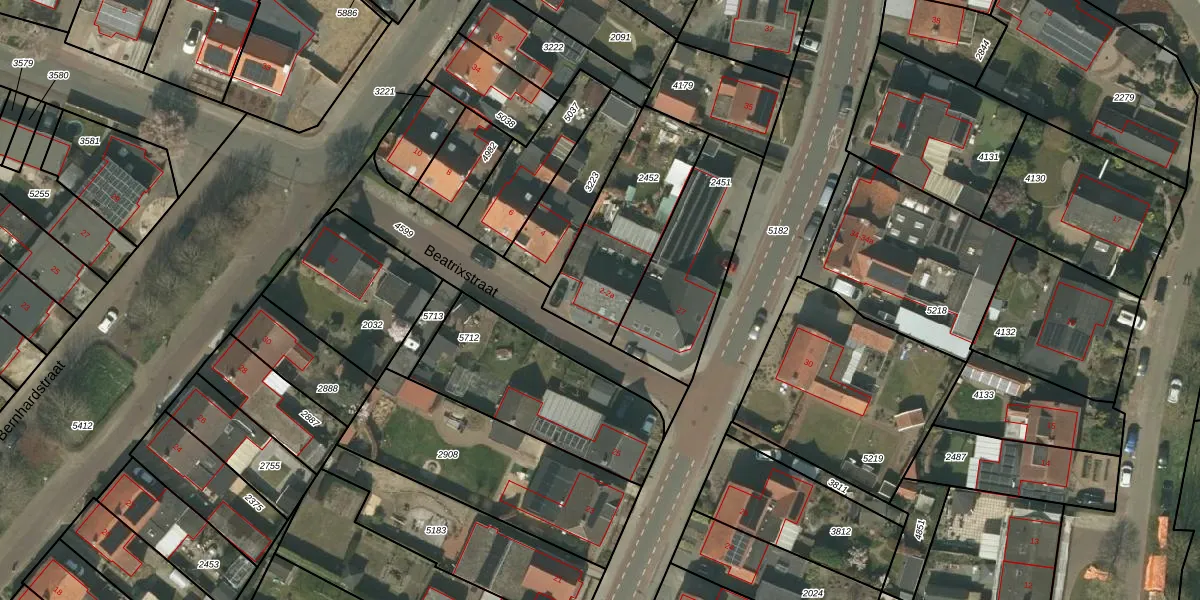 Het perceel waarop Beatrixstraat 2 staat heeft een oppervlakte van 480 m². Dit is een groot perceel. De perceeloppervlakte wordt geregistreerd door het Kadaster. Gedetailleerde informatie over de maten van dit perceel kunt u vinden in het rapport Kadastrale kaart met maatvoering van Beatrixstraat 2.