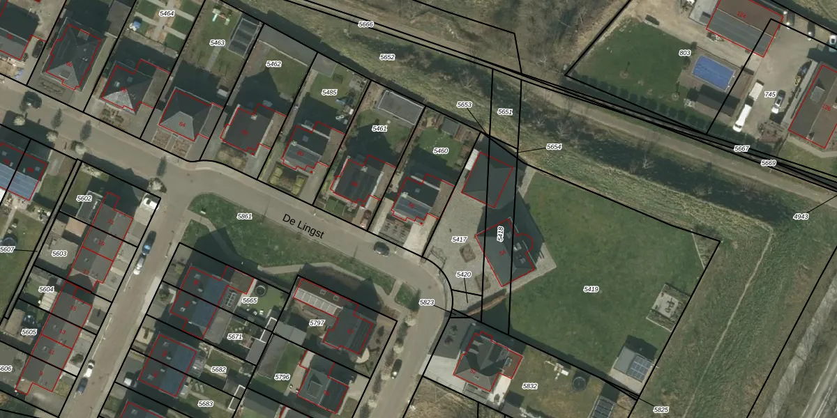 Het perceel waarop De Lingst 56 staat heeft een oppervlakte van 480 m². Dit is een groot perceel. De perceeloppervlakte wordt geregistreerd door het Kadaster. Gedetailleerde informatie over de maten van dit perceel kunt u vinden in het rapport Kadastrale kaart met maatvoering van De Lingst 56.