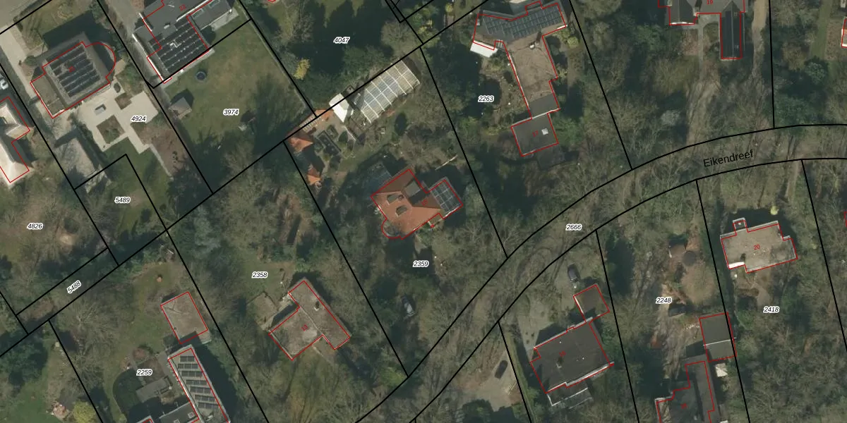 Het perceel waarop Eikendreef 15 staat heeft een oppervlakte van 2200 m². Dit is een zeer groot perceel. De perceeloppervlakte wordt geregistreerd door het Kadaster. Gedetailleerde informatie over de maten van dit perceel kunt u vinden in het rapport Kadastrale kaart met maatvoering van Eikendreef 15.