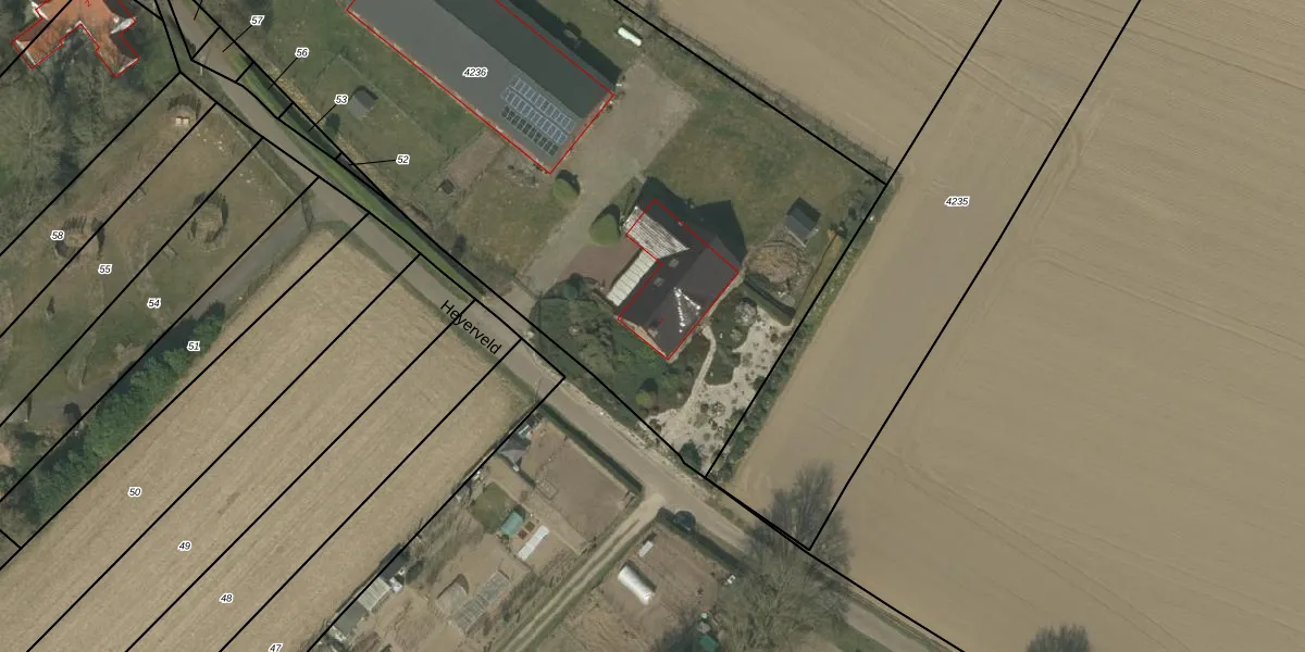 Het perceel waarop Heyerveld 1 staat heeft een oppervlakte van 5570 m². Dit is een zeer groot perceel. De perceeloppervlakte wordt geregistreerd door het Kadaster. Gedetailleerde informatie over de maten van dit perceel kunt u vinden in het rapport Kadastrale kaart met maatvoering van Heyerveld 1.