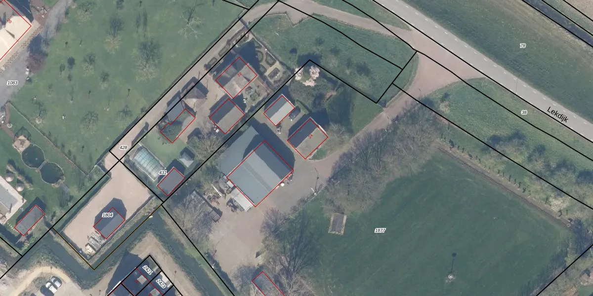 Het perceel waarop Lekdijk 24 staat heeft een oppervlakte van 9665 m². Dit is een zeer groot perceel. De perceeloppervlakte wordt geregistreerd door het Kadaster. Gedetailleerde informatie over de maten van dit perceel kunt u vinden in het rapport Kadastrale kaart met maatvoering van Lekdijk 24.