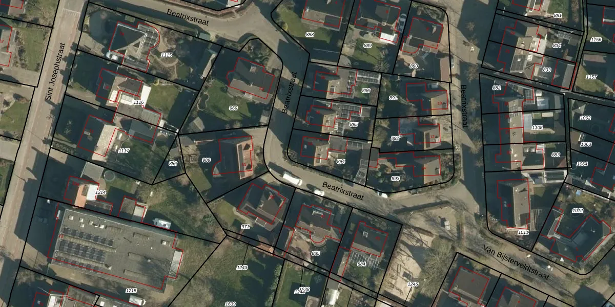 Het perceel waarop Beatrixstraat 16 staat heeft een oppervlakte van 332 m². Dit is een groot perceel. De perceeloppervlakte wordt geregistreerd door het Kadaster. Gedetailleerde informatie over de maten van dit perceel kunt u vinden in het rapport Kadastrale kaart met maatvoering van Beatrixstraat 16.