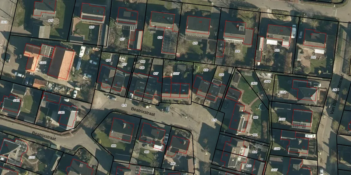 Het perceel waarop Beatrixstraat 17 staat heeft een oppervlakte van 422 m². Dit is een groot perceel. De perceeloppervlakte wordt geregistreerd door het Kadaster. Gedetailleerde informatie over de maten van dit perceel kunt u vinden in het rapport Kadastrale kaart met maatvoering van Beatrixstraat 17.