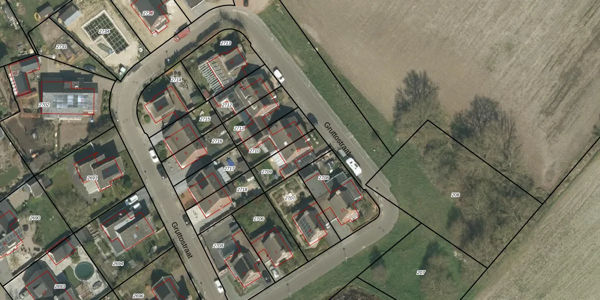 Gruttostraat 20 is gelegen op kadastraal perceel HSL00C2709. Deze kadastrale aanduiding is uniek en wordt gebruikt door het Kadaster om eigendomsrechten en andere zakelijke rechten vast te leggen. Het perceel maakt onderdeel uit van de kadastrale gemeente Hunsel.