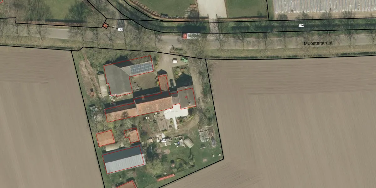 Het perceel waarop Moosterstraat 16 staat heeft een oppervlakte van 4825 m². Dit is een zeer groot perceel. De perceeloppervlakte wordt geregistreerd door het Kadaster. Gedetailleerde informatie over de maten van dit perceel kunt u vinden in het rapport Kadastrale kaart met maatvoering van Moosterstraat 16.