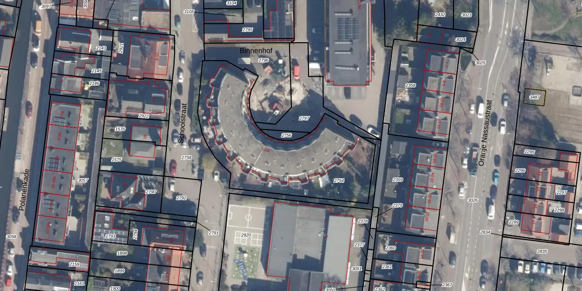 Het perceel waarop Binnenhof 21 staat heeft een oppervlakte van 1581 m². Dit is een zeer groot perceel. De perceeloppervlakte wordt geregistreerd door het Kadaster. Gedetailleerde informatie over de maten van dit perceel kunt u vinden in het rapport Kadastrale kaart met maatvoering van Binnenhof 21.