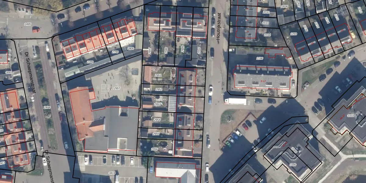 Gebruik de zoekbalk of klik op een perceel voor informatie over de adressen binnen dit perceel.