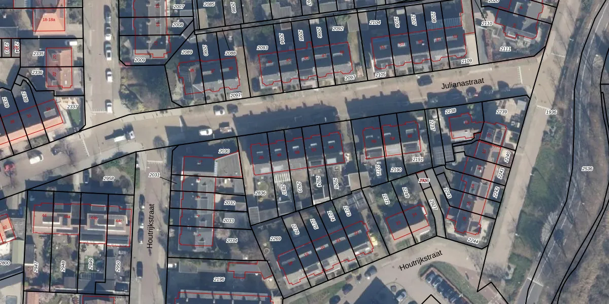 Het perceel waarop Julianastraat 50 staat heeft een oppervlakte van 159 m². Dit is een middelgroot perceel. De perceeloppervlakte wordt geregistreerd door het Kadaster. Gedetailleerde informatie over de maten van dit perceel kunt u vinden in het rapport Kadastrale kaart met maatvoering van Julianastraat 50.