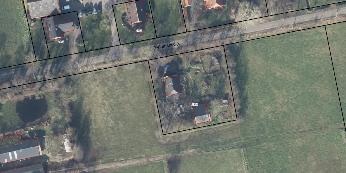 Het perceel waarop Bielemansdijk 13 staat heeft een oppervlakte van 1935 m². Dit is een zeer groot perceel. De perceeloppervlakte wordt geregistreerd door het Kadaster. Gedetailleerde informatie over de maten van dit perceel kunt u vinden in het rapport Kadastrale kaart met maatvoering van Bielemansdijk 13.