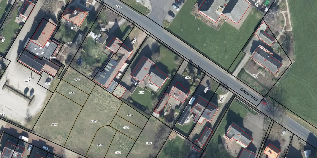 Het perceel waarop Dorpsstraat 97 staat heeft een oppervlakte van 1180 m². Dit is een zeer groot perceel. De perceeloppervlakte wordt geregistreerd door het Kadaster. Gedetailleerde informatie over de maten van dit perceel kunt u vinden in het rapport Kadastrale kaart met maatvoering van Dorpsstraat 97.