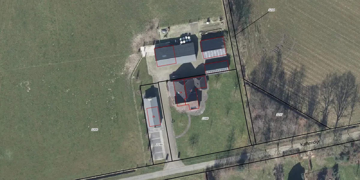 Het perceel waarop Kattendijk 2-a staat heeft een oppervlakte van 1950 m². Dit is een zeer groot perceel. De perceeloppervlakte wordt geregistreerd door het Kadaster. Gedetailleerde informatie over de maten van dit perceel kunt u vinden in het rapport Kadastrale kaart met maatvoering van Kattendijk 2-a.