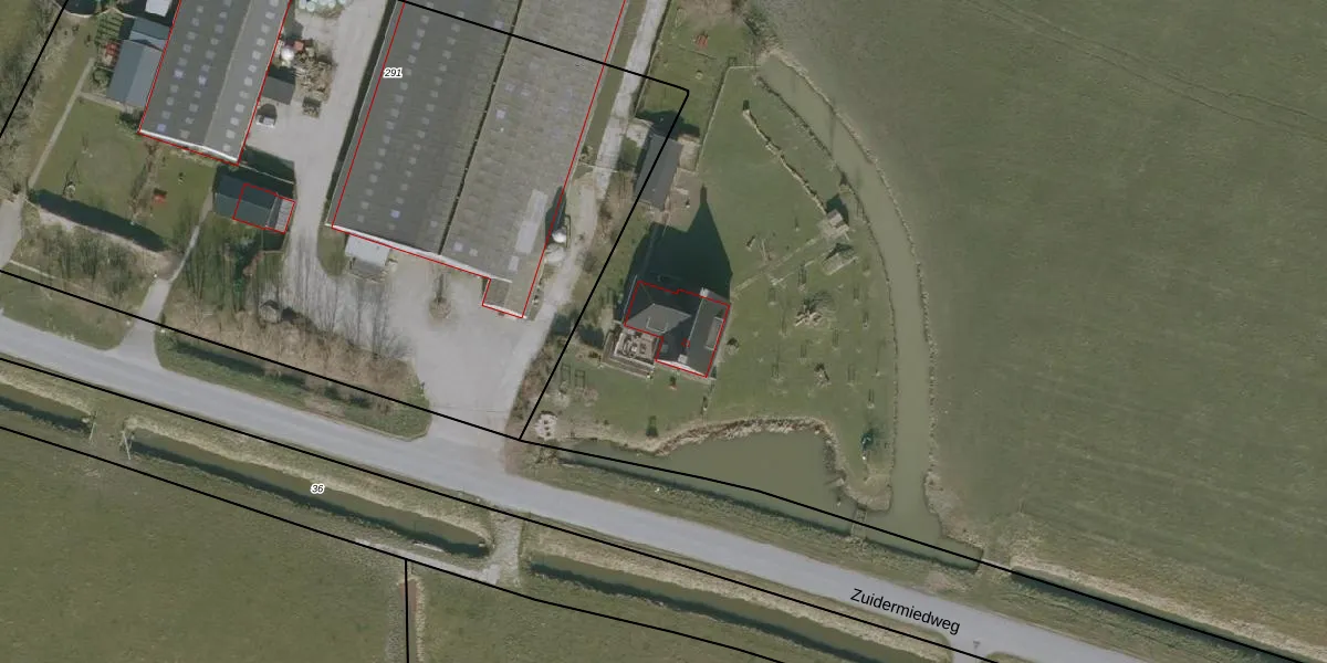 Het perceel waarop Zuidermiedweg 21 staat heeft een oppervlakte van 3,3 ha. Dit is een zeer groot perceel. De perceeloppervlakte wordt geregistreerd door het Kadaster. Gedetailleerde informatie over de maten van dit perceel kunt u vinden in het rapport Kadastrale kaart met maatvoering van Zuidermiedweg 21.