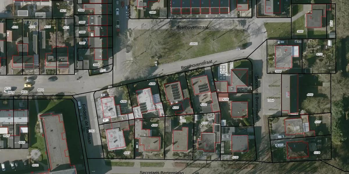 Het perceel waarop Beethovenstraat 4 staat heeft een oppervlakte van 390 m². Dit is een groot perceel. De perceeloppervlakte wordt geregistreerd door het Kadaster. Gedetailleerde informatie over de maten van dit perceel kunt u vinden in het rapport Kadastrale kaart met maatvoering van Beethovenstraat 4.