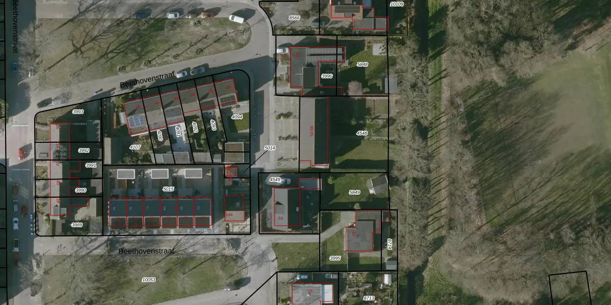 Het perceel waarop Beethovenstraat 52-G016 staat heeft een oppervlakte van 725 m². Dit is een groot perceel. De perceeloppervlakte wordt geregistreerd door het Kadaster. Gedetailleerde informatie over de maten van dit perceel kunt u vinden in het rapport Kadastrale kaart met maatvoering van Beethovenstraat 52-G016.