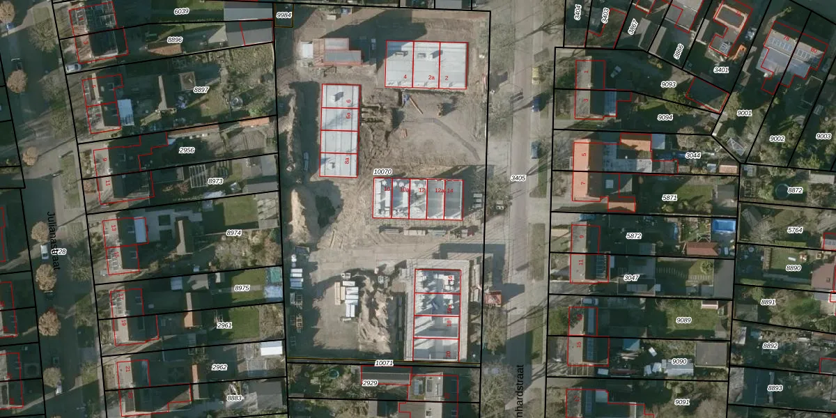 Het perceel waarop Bernhardstraat 12 staat heeft een oppervlakte van 4134 m². Dit is een zeer groot perceel. De perceeloppervlakte wordt geregistreerd door het Kadaster. Gedetailleerde informatie over de maten van dit perceel kunt u vinden in het rapport Kadastrale kaart met maatvoering van Bernhardstraat 12.