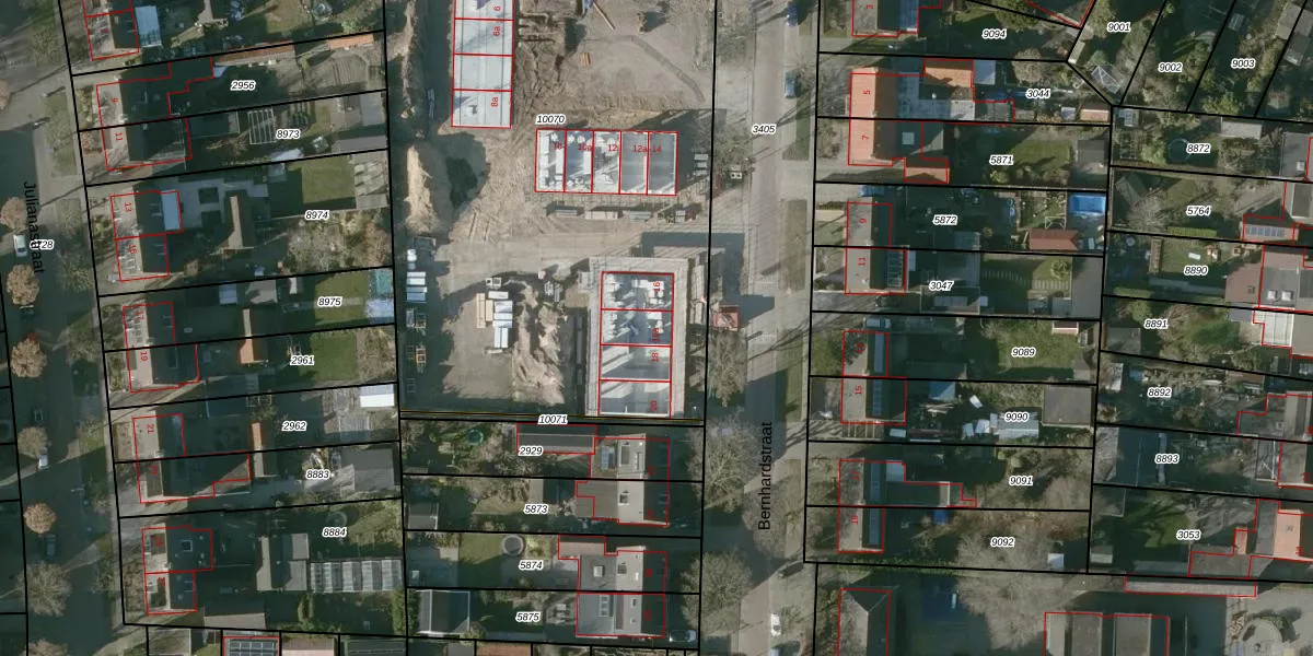Het perceel waarop Bernhardstraat 16-a staat heeft een oppervlakte van 4134 m². Dit is een zeer groot perceel. De perceeloppervlakte wordt geregistreerd door het Kadaster. Gedetailleerde informatie over de maten van dit perceel kunt u vinden in het rapport Kadastrale kaart met maatvoering van Bernhardstraat 16-a.