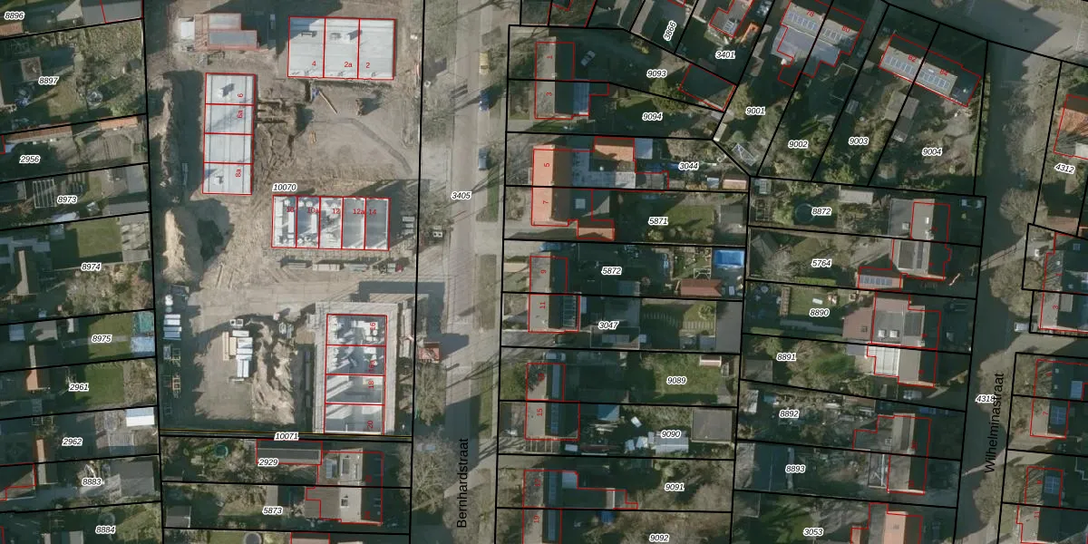 Het perceel waarop Bernhardstraat 9 staat heeft een oppervlakte van 438 m². Dit is een groot perceel. De perceeloppervlakte wordt geregistreerd door het Kadaster. Gedetailleerde informatie over de maten van dit perceel kunt u vinden in het rapport Kadastrale kaart met maatvoering van Bernhardstraat 9.