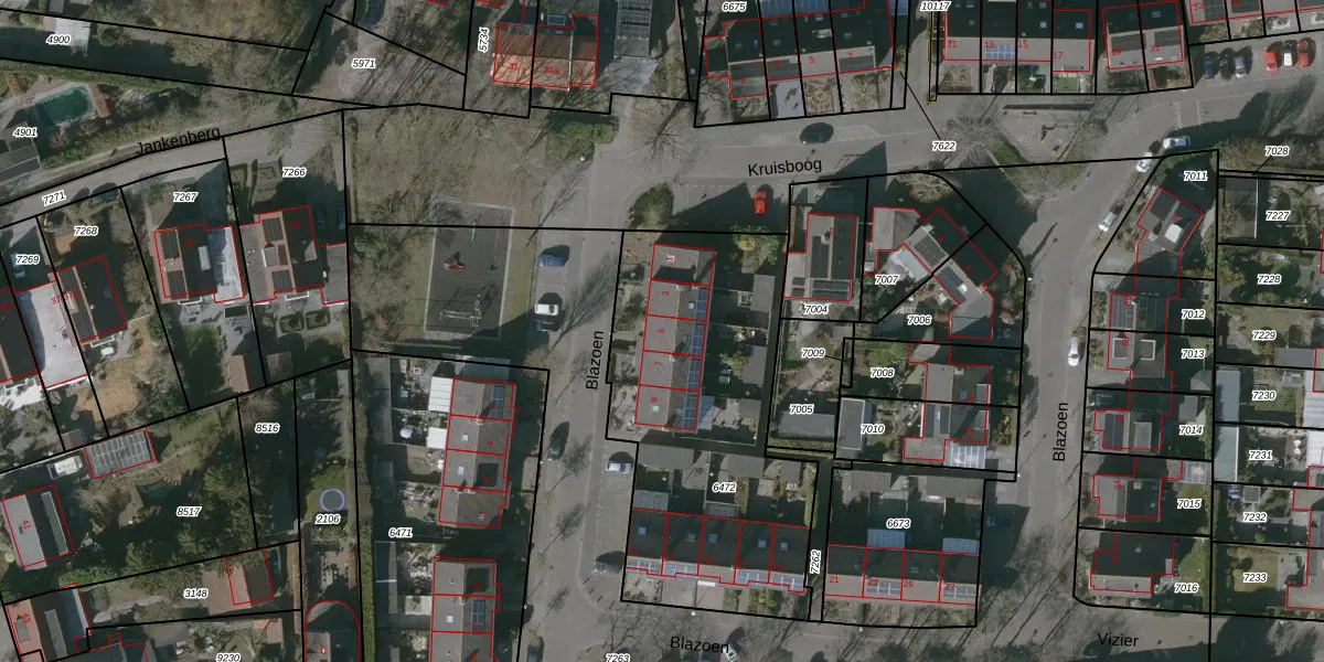 Blazoen 5 is gelegen op kadastraal perceel HSR00C6472. Deze kadastrale aanduiding is uniek en wordt gebruikt door het Kadaster om eigendomsrechten en andere zakelijke rechten vast te leggen. Het perceel maakt onderdeel uit van de kadastrale gemeente Halsteren.