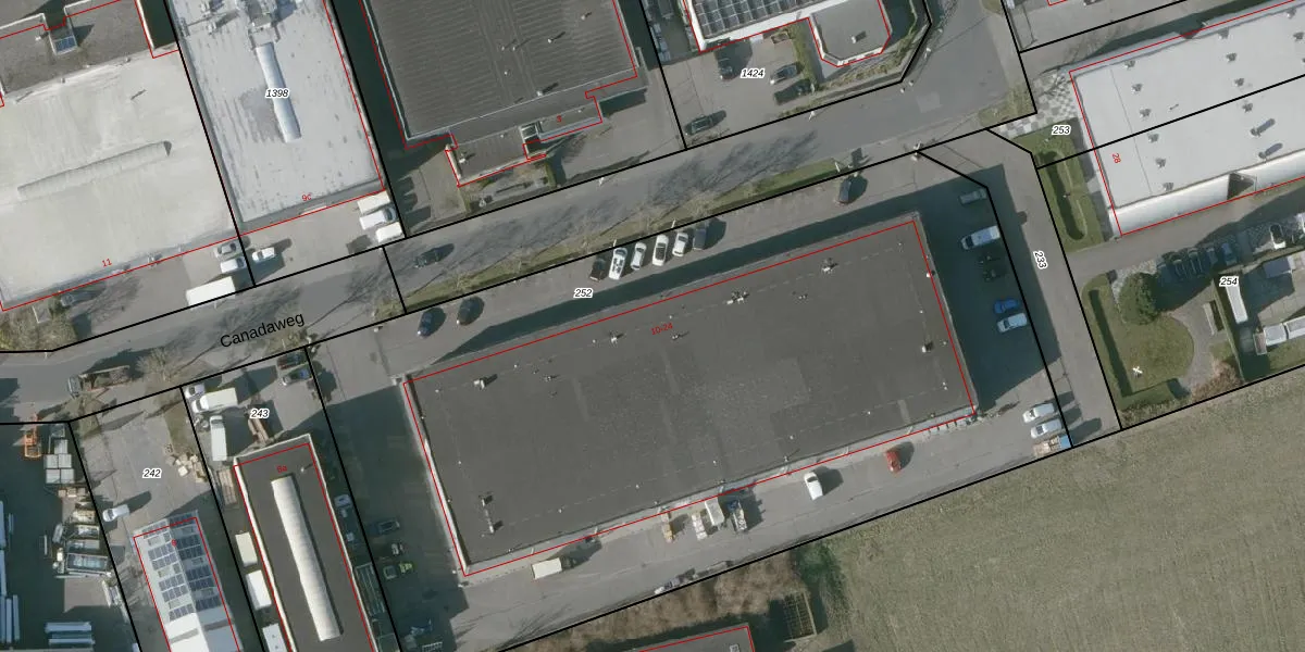 Het perceel waarop Canadaweg 12-a staat heeft een oppervlakte van 5586 m². Dit is een zeer groot perceel. De perceeloppervlakte wordt geregistreerd door het Kadaster. Gedetailleerde informatie over de maten van dit perceel kunt u vinden in het rapport Kadastrale kaart met maatvoering van Canadaweg 12-a.