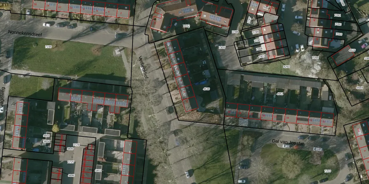 Het perceel waarop Verbeekhof 9 staat heeft een oppervlakte van 1393 m². Dit is een zeer groot perceel. De perceeloppervlakte wordt geregistreerd door het Kadaster. Gedetailleerde informatie over de maten van dit perceel kunt u vinden in het rapport Kadastrale kaart met maatvoering van Verbeekhof 9.
