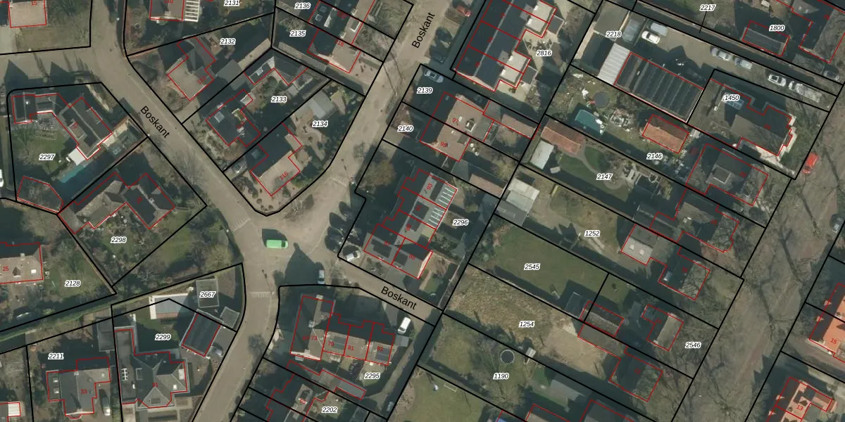 Het perceel waarop Boskant 91 staat heeft een oppervlakte van 884 m². Dit is een groot perceel. De perceeloppervlakte wordt geregistreerd door het Kadaster. Gedetailleerde informatie over de maten van dit perceel kunt u vinden in het rapport Kadastrale kaart met maatvoering van Boskant 91.